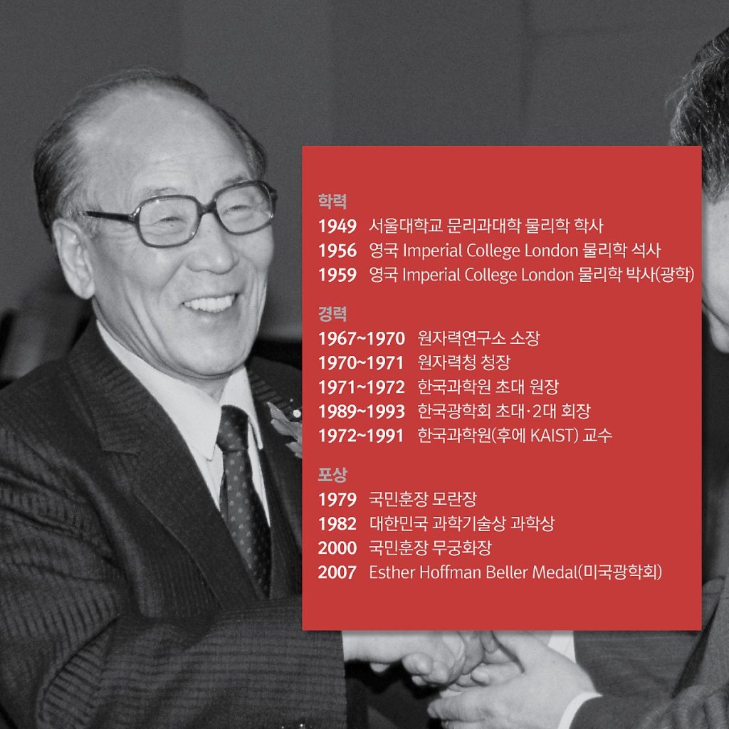 과학기술의 불모지인 우리나라 과학기술 발전에 큰 족적을 남긴 고인은 1967년 원자력 연구소 소장, 1970년 원자력청장 등을 역임한 후에 1971년 KAIST의 전신인 한국과학원의 초대 원장과 1989년 KAIST 6대 원장을 맡아 고급 과학 기술 두뇌 양성 기관으로 성장시켰다. 1972~1992년 KAIST 물리학과 교수로 재직했다.